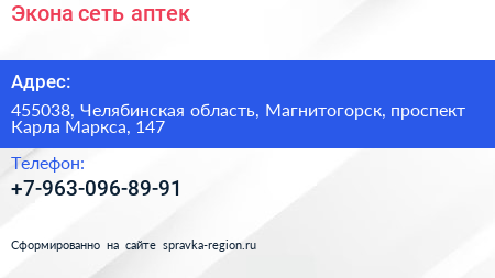 Экона, сеть аптек по адресу 455038, Челябинская область, Магнитогорск, проспект Карла Маркса, 147 в дальнейшем Организация, размещена в следующих категориях: