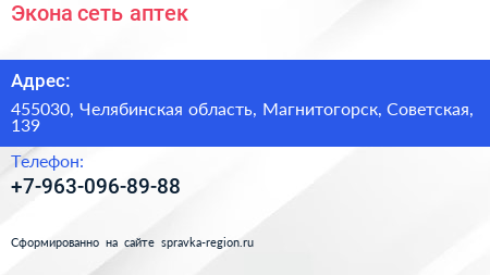 Экона, сеть аптек по адресу 455030, Челябинская область, Магнитогорск, Советская, 139 в дальнейшем Организация, размещена в следующих категориях: