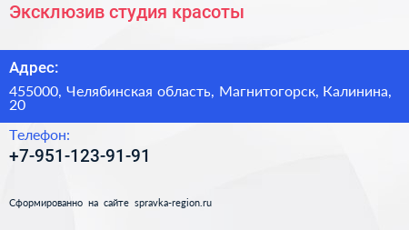 Эксклюзив, студия красоты по адресу 455000, Челябинская область, Магнитогорск, Калинина, 20 в дальнейшем Организация, размещена в следующих категориях: