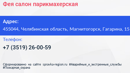 Фея, салон-парикмахерская по адресу 455044, Челябинская область, Магнитогорск, Гагарина, 15 в дальнейшем Организация, размещена в следующих категориях: