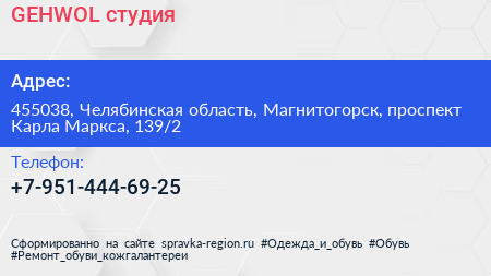 GEHWOL, студия по адресу 455038, Челябинская область, Магнитогорск, проспект Карла Маркса, 139/2 в дальнейшем Организация, размещена в следующих категориях: