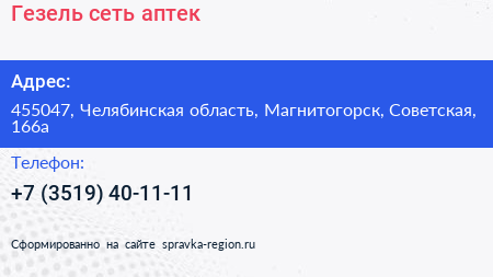 Гезель, сеть аптек по адресу 455047, Челябинская область, Магнитогорск, Советская, 166а в дальнейшем Организация, размещена в следующих категориях: