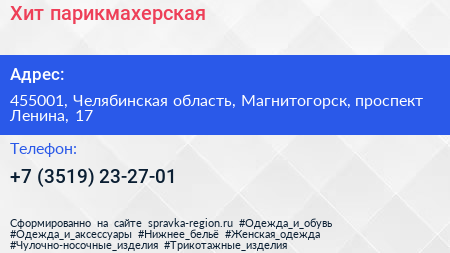 Хит, парикмахерская по адресу 455001, Челябинская область, Магнитогорск, проспект Ленина, 17 в дальнейшем Организация, размещена в следующих категориях: