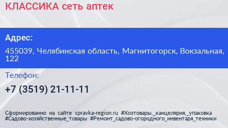 КЛАССИКА, сеть аптек по адресу 455039, Челябинская область, Магнитогорск, Вокзальная, 122 в дальнейшем Организация, размещена в следующих категориях: