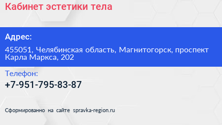 Кабинет эстетики тела по адресу 455051, Челябинская область, Магнитогорск, проспект Карла Маркса, 202 в дальнейшем Организация, размещена в следующих категориях: