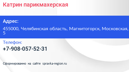 Катрин, парикмахерская по адресу 455000, Челябинская область, Магнитогорск, Московская, 5 в дальнейшем Организация, размещена в следующих категориях: