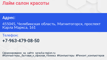 Лайм, салон красоты по адресу 455045, Челябинская область, Магнитогорск, проспект Карла Маркса, 161 в дальнейшем Организация, размещена в следующих категориях: