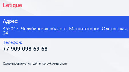 Letique по адресу 455047, Челябинская область, Магнитогорск, Ольховская, 24 в дальнейшем Организация, размещена в следующих категориях: