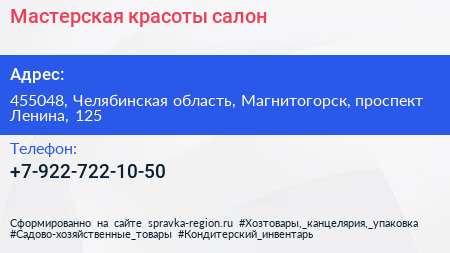 Мастерская красоты, салон по адресу 455048, Челябинская область, Магнитогорск, проспект Ленина, 125 в дальнейшем Организация, размещена в следующих категориях: