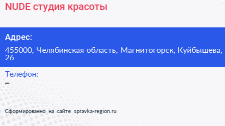 NUDE, студия красоты по адресу 455000, Челябинская область, Магнитогорск, Куйбышева, 26 в дальнейшем Организация, размещена в следующих категориях: