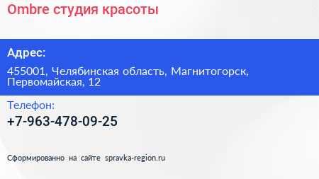 Ombre, студия красоты по адресу 455001, Челябинская область, Магнитогорск, Первомайская, 12 в дальнейшем Организация, размещена в следующих категориях: