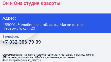 Он и Она, студия красоты по адресу 455001, Челябинская область, Магнитогорск, Первомайская, 20 в дальнейшем Организация, размещена в следующих категориях: