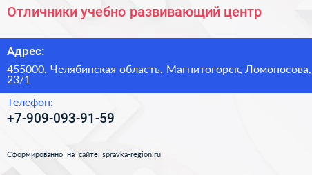 Отличники, учебно-развивающий центр по адресу 455000, Челябинская область, Магнитогорск, Ломоносова, 23/1 в дальнейшем Организация, размещена в следующих категориях: