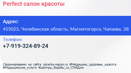 Perfect, салон красоты по адресу 455023, Челябинская область, Магнитогорск, Чапаева, 28 в дальнейшем Организация, размещена в следующих категориях: