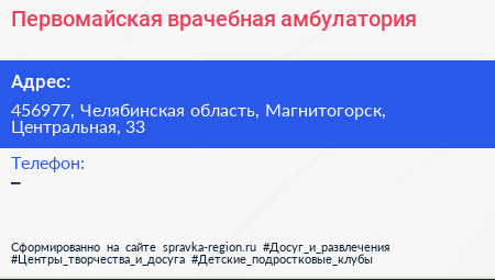 Первомайская врачебная амбулатория по адресу 456977, Челябинская область, Магнитогорск, Центральная, 33 в дальнейшем Организация, размещена в следующих категориях: