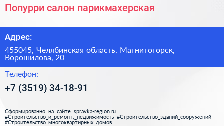 Попурри, салон-парикмахерская по адресу 455045, Челябинская область, Магнитогорск, Ворошилова, 20 в дальнейшем Организация, размещена в следующих категориях: