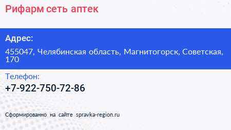 Рифарм, сеть аптек по адресу 455047, Челябинская область, Магнитогорск, Советская, 170 в дальнейшем Организация, размещена в следующих категориях: