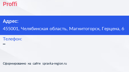 Рroffi по адресу 455001, Челябинская область, Магнитогорск, Герцена, 6 в дальнейшем Организация, размещена в следующих категориях: