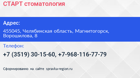 СТАРТ, стоматология по адресу 455045, Челябинская область, Магнитогорск, Ворошилова, 8 в дальнейшем Организация, размещена в следующих категориях: