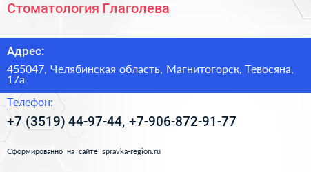 Стоматология Глаголева по адресу 455047, Челябинская область, Магнитогорск, Тевосяна, 17а в дальнейшем Организация, размещена в следующих категориях: