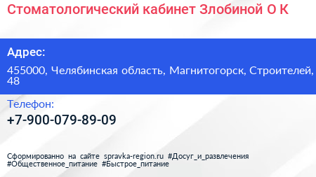Стоматологический кабинет Злобиной О.К. по адресу 455000, Челябинская область, Магнитогорск, Строителей, 48 в дальнейшем Организация, размещена в следующих категориях: