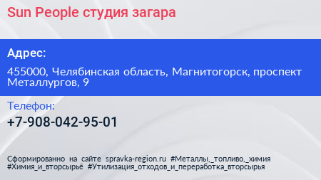 Sun People, студия загара по адресу 455000, Челябинская область, Магнитогорск, проспект Металлургов, 9 в дальнейшем Организация, размещена в следующих категориях:
