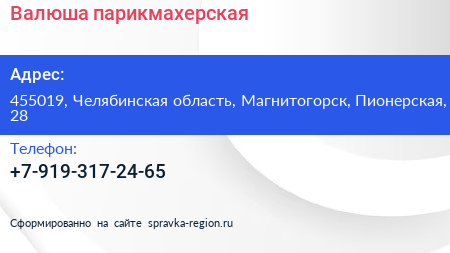 Валюша, парикмахерская по адресу 455019, Челябинская область, Магнитогорск, Пионерская, 28 в дальнейшем Организация, размещена в следующих категориях: