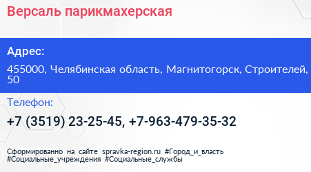 Версаль, парикмахерская по адресу 455000, Челябинская область, Магнитогорск, Строителей, 50 в дальнейшем Организация, размещена в следующих категориях: