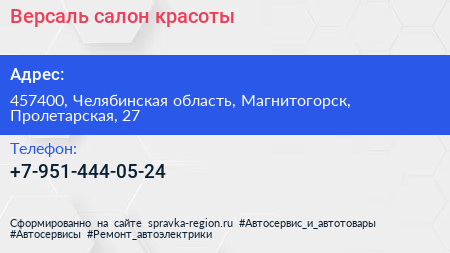 Версаль, салон красоты по адресу 457400, Челябинская область, Магнитогорск, Пролетарская, 27 в дальнейшем Организация, размещена в следующих категориях: