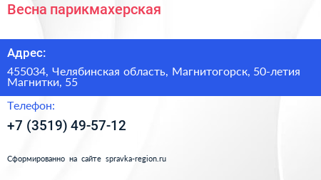 Весна, парикмахерская по адресу 455034, Челябинская область, Магнитогорск, 50-летия Магнитки, 55 в дальнейшем Организация, размещена в следующих категориях: