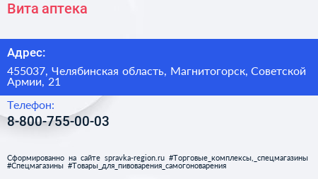 Вита, аптека по адресу 455037, Челябинская область, Магнитогорск, Советской Армии, 21 в дальнейшем Организация, размещена в следующих категориях: