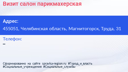 Визит, салон-парикмахерская по адресу 455051, Челябинская область, Магнитогорск, Труда, 31 в дальнейшем Организация, размещена в следующих категориях: