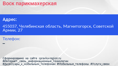 Воск, парикмахерская по адресу 455037, Челябинская область, Магнитогорск, Советской Армии, 27 в дальнейшем Организация, размещена в следующих категориях: