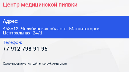 Центр медицинской пиявки по адресу 453612, Челябинская область, Магнитогорск, Центральная, 24/1 в дальнейшем Организация, размещена в следующих категориях: