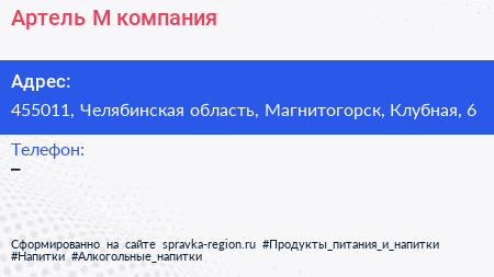 Артель-М, компания по адресу 455011, Челябинская область, Магнитогорск, Клубная, 6 в дальнейшем Организация, размещена в следующих категориях: