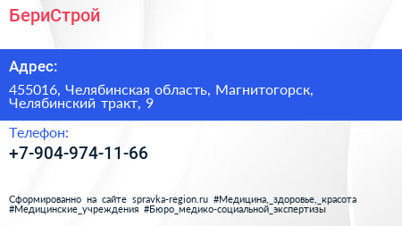 БериСтрой по адресу 455016, Челябинская область, Магнитогорск, Челябинский тракт, 9 в дальнейшем Организация, размещена в следующих категориях: