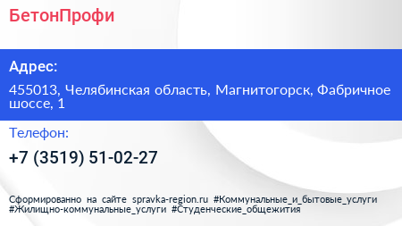 БетонПрофи по адресу 455013, Челябинская область, Магнитогорск, Фабричное шоссе, 1 в дальнейшем Организация, размещена в следующих категориях: