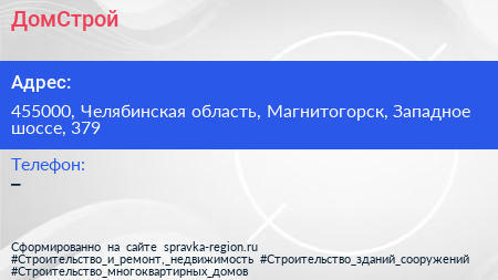 ДомСтрой по адресу 455000, Челябинская область, Магнитогорск, Западное шоссе, 379 в дальнейшем Организация, размещена в следующих категориях: