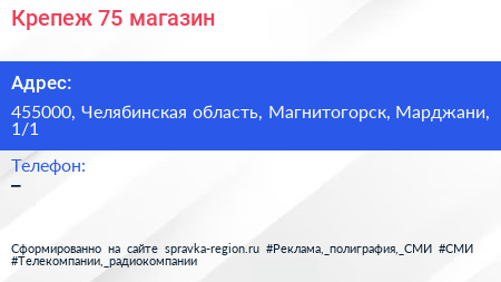 Крепеж 75, магазин по адресу 455000, Челябинская область, Магнитогорск, Марджани, 1/1 в дальнейшем Организация, размещена в следующих категориях: