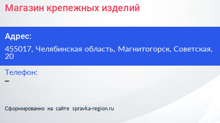 Магазин крепежных изделий по адресу 455017, Челябинская область, Магнитогорск, Советская, 20 в дальнейшем Организация, размещена в следующих категориях: