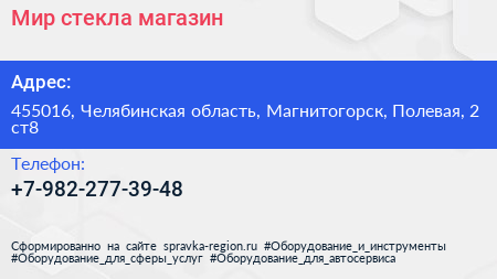 Мир стекла, магазин по адресу 455016, Челябинская область, Магнитогорск, Полевая, 2 ст8 в дальнейшем Организация, размещена в следующих категориях: