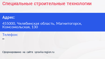 Специальные строительные технологии по адресу 455000, Челябинская область, Магнитогорск, Комсомольская, 130 в дальнейшем Организация, размещена в следующих категориях: