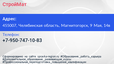 СтройМат по адресу 455007, Челябинская область, Магнитогорск, 9 Мая, 14в в дальнейшем Организация, размещена в следующих категориях: