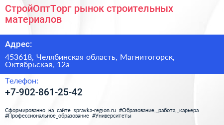 СтройОптТорг, рынок строительных материалов по адресу 453618, Челябинская область, Магнитогорск, Октябрьская, 12а в дальнейшем Организация, размещена в следующих категориях: