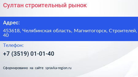 Султан, строительный рынок по адресу 453618, Челябинская область, Магнитогорск, Строителей, 40 в дальнейшем Организация, размещена в следующих категориях: