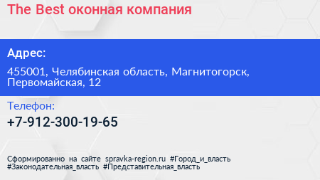 The Best, оконная компания по адресу 455001, Челябинская область, Магнитогорск, Первомайская, 12 в дальнейшем Организация, размещена в следующих категориях: