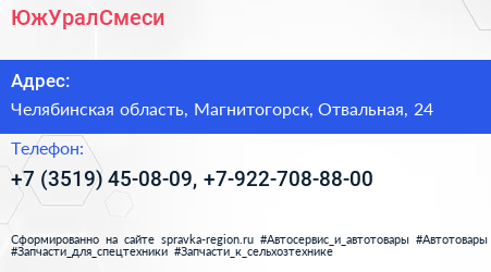 ЮжУралСмеси по адресу Челябинская область, Магнитогорск, Отвальная, 24 в дальнейшем Организация, размещена в следующих категориях: