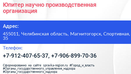 Юпитер, научно-производственная организация по адресу 455011, Челябинская область, Магнитогорск, Спортивная, 35 в дальнейшем Организация, размещена в следующих категориях: