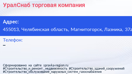 УралСнаб, торговая компания по адресу 455013, Челябинская область, Магнитогорск, Лазника, 37а в дальнейшем Организация, размещена в следующих категориях: