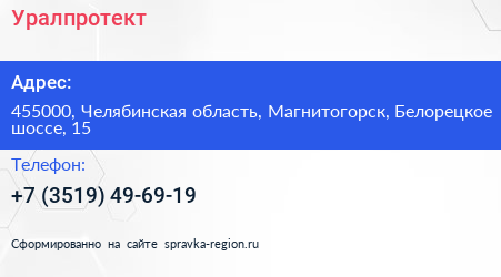 Уралпротект по адресу 455000, Челябинская область, Магнитогорск, Белорецкое шоссе, 15 в дальнейшем Организация, размещена в следующих категориях: